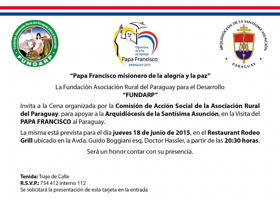 Asunción, IP.- La Comisión de Acción Social de la Asociación Rural del Paraguay (ARP) realiza una cena a beneficio de la Arquidiócesis de la Santísima Asunción ante la visita del Papa Francisco a Paraguay, la cena será este jueves a las 20:30 en el restaurante Rodeo Grill. Las adhesiones tienen un costo de  150.000 guaraníes por persona.