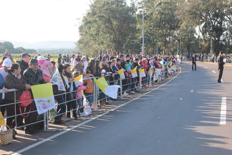 Asunción, IP.- A las 09:00 de este sábado el Santo Padre partirá camino al Santuario Nacional de Caacupé en vehículo  automotor. Treinta minutos después, se tiene prevista la llegada al Km. 48 Kurusu Peregrino, donde se hará el trasbordo al Papamóvil para llegar al Santuario a las 10:00. Mientras tanto miles de feligreses lo aguardan estoicamente.