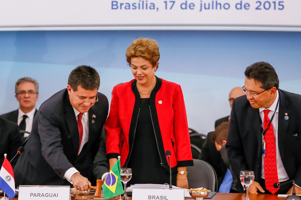 Como conclusión de la 48ª Cumbre del Mercosur, la presidenta del Brasil, Dilma Rousseff, entregó el martillo que representa la presidencia pro témpore del bloque al presidente paraguayo.