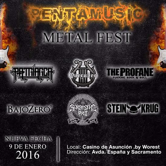 A continuación, a partir de las 19:00, el estacionamiento del Casino de Asunción empezará a vibrar con el potente cartel del «Pentamusic Metal Fest»conformado por Patriarca (thrash metal); Querubes (heavy metal); The Profane (rock n’ roll punk metal); BajoZero (hard rock); Sadistic Art (death metal) y Steinkrug (rock and roll); las seis bandas que conforman el gran show independiente de rock-metal.