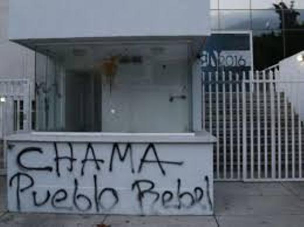 Mientras uno de los individuos dejaba una pintada frente al edificio, que rezaba la frase «Chama Pueblo Rebelde», los otros arrojaron excremento antes de darse a la fuga.