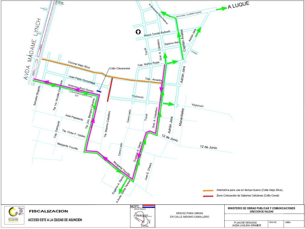 Conforme a al esquema de circulación, presentado por la contratista, se solicita además el mejoramiento de la calle M. Youville, desde su intersección con la calle Tte. 2do. Benigno Cáceres hasta la calle Gral. Garay (recientemente asfaltada por el MOPC) que va hasta la Avda. Santa Teresa, y habilitada como vía alternativa, así como su conexión a la calle Abdón Caballero, para la salida hacia Luque. (Se adjunta plano).