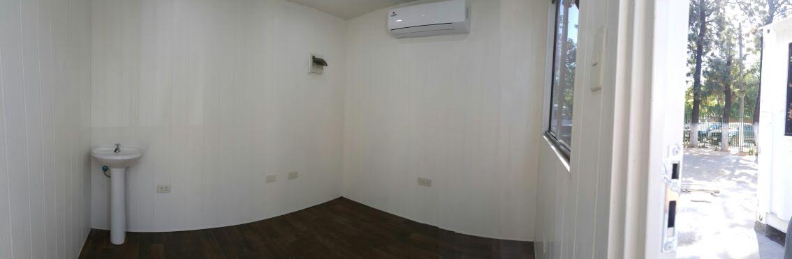 Cada contenedor cuenta con aislamiento térmico, pisos vinílicos de alto tránsito, acondicionadores de aire de 12 BTU y lavadero de manos en cada uno.