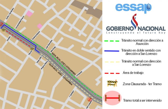 Asunción, IP.- A partir del lunes 06 de febrero, continuarán los trabajos de alcantarillado sanitario sobre la Ruta Mariscal Estigarribia, en el tramo de la calle Rafael Franco hasta la calle Leopardi de la ciudad de Fernando de la Mora. Por 60 días estará habilitada la calzada contraria a la zona de obra, para el tránsito en doble sentido.