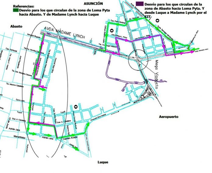 Dirección sur – este: Los que circulan desde la zona del Mercado de Abasto con dirección a Luque, lo harán por Madame Lynch, girar en la calle Sinforiano Buzó Gómez, pasar por el costado del CIT, empalmar con la calle Ybyturuzú, tomar la calle General Caballero hasta llegar a la calle Capitán Rojas y empalmar con la calle Capitán Ávalos, que sale en General Elizardo Aquino.