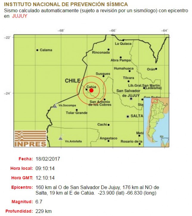 Según informó el Instituto Nacional de Prevención Sísmica de Argentina, el movimiento de mayor intensidad se registró a las 09:10 hora local (12:10 GMT) y su epicentro fue localizado a 160 kilómetros al oeste de la capital provincial, San Salvador de Jujuy, y a 19 kilómetros al este de la localidad de Catúa, en la vecina provincia de Salta.
