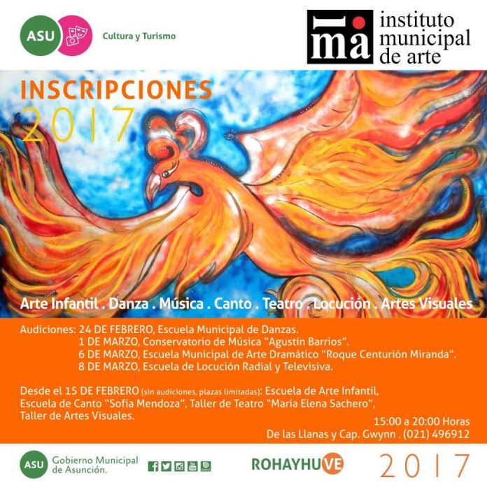 Asunción, IP.- Prosiguen las inscripciones para todas las escuelas y talleres artísticos del Instituto Municipal de Arte de la Municipalidad de Asunción (IMA). Los interesados deben concurrir de lunes a viernes de 15:00 a 20:00 hs. al local del IMA sito en De las Llanas esquina Cap. Gwynn del Barrio Sajonia y asistir a las audiciones.
