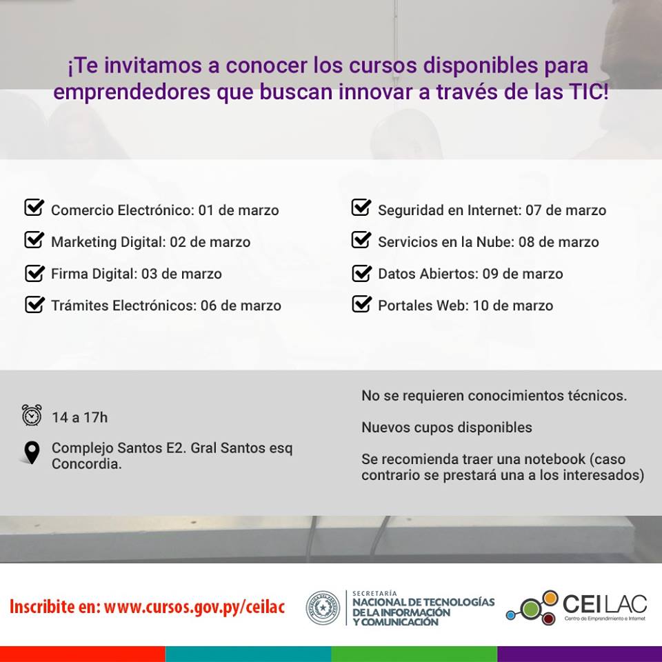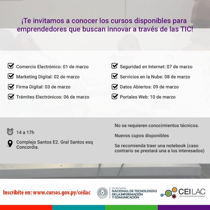 Las inscripciones para todos los cursos se realizan en línea a través de la plataforma www.cursos.gov.py. La Senatics informa que se han ampliado los cupos para la serie que inicia a partir de este miércoles.