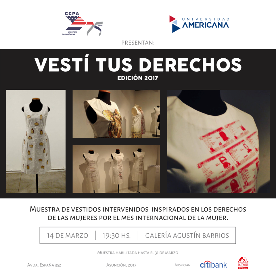Asunción, IP.- Artistas visuales presentarán el resultado de intervenciones artísticas sobre vestidos blancos, en la muestra denominada “Vestí tus derechos – edición 2017”, que se inaugura el 14 de marzo a las 19:30, en la Galería Agustín Barrios del Centro Cultural Paraguayo Americano (CCPA) de Asunción, España 352 e/ Brasil y EE.UU.