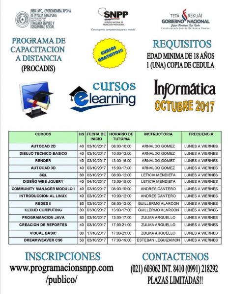 Asunción, IP.- El Servicio Nacional de Promoción Profesional (SNPP), por intermedio de su Programa de Capacitación a Distancia (Procadis), habilitó el periodo de inscripciones para los nuevos cursos online gratuitos que ofrecerá este octubre en las áreas de informática, empresariales e idiomas, a través de su plataforma e – learning.