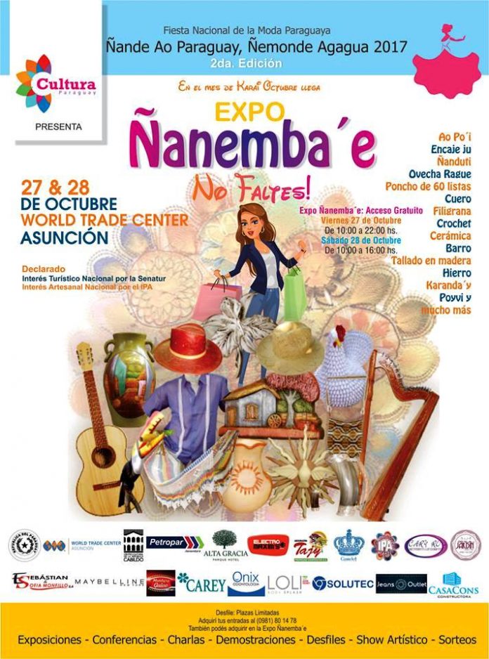 Asunción, IP.- El viernes 27 y sábado 28 de octubre se desarrollará en la sede del World Trade Center de Asunción, la Fiesta Nacional de la Moda paraguaya “Ñande ao Paraguay-Ñemonde ãgagua 2017” con interesantes actividades gratuitas para todo público.