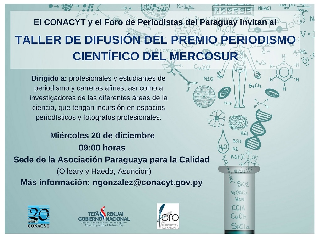 Asunción, IP.- El Consejo Nacional de Ciencia y Tecnología (CONACYT) y el Foro de Periodistas del Paraguay (FOPEP) invitan al taller de difusión sobre los premios de periodismo científico del Mercosur y nacional.