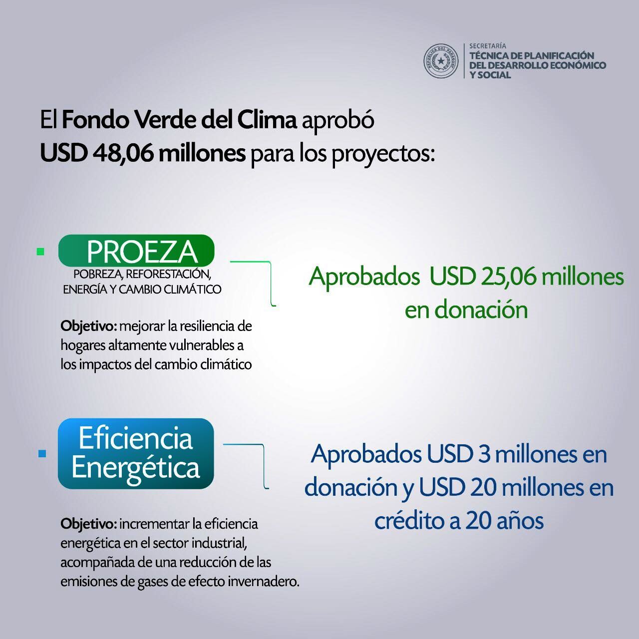 Asunción, IP.- Los proyectos Pobreza, Reforestación, Energía y Cambio Climático (Proeza) y Eficiencia Energética (EE), recibirán fondos por valor de 48,06 millones de dólares, recientemente aprobados en Corea del Sur por el Fondo Verde del Clima (FVC).