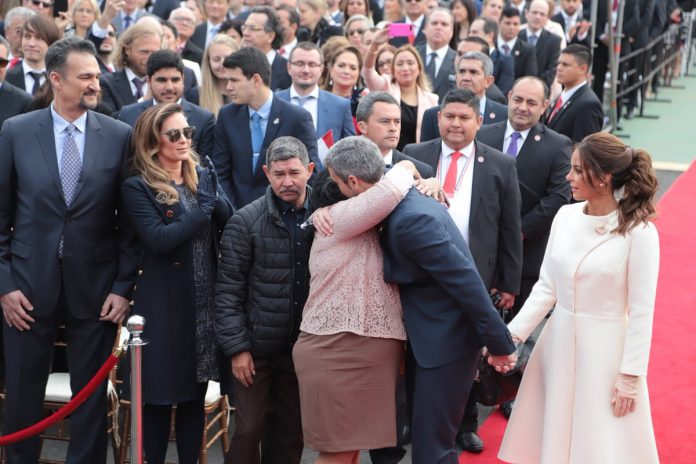 Durante el acto realizado ayer en la fachada litoral del Palacio de Gobierno, doña Obdulia Florenciano y su esposo, don Apolonio Morínigo, estuvieron entre los invitados de honor y a su llegada al palco, antes de prestar juramente, el presidente Abdo Benítez los saludo y abrazó efusivamente.