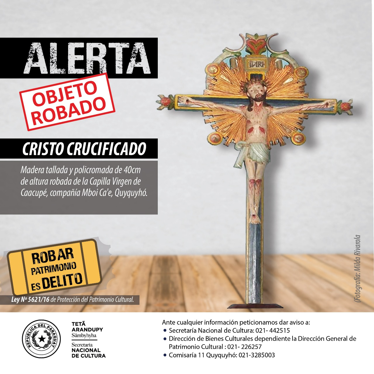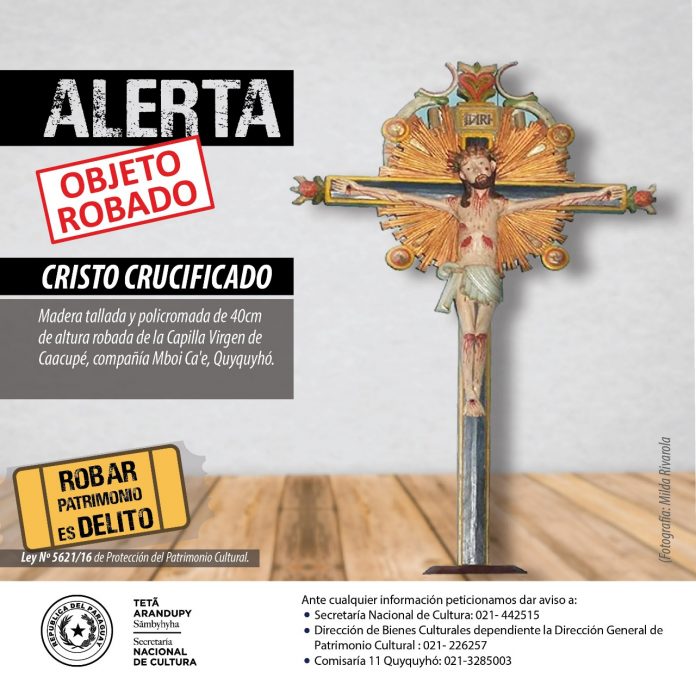 Este lamentable hecho se ha replicado en la Capilla Virgen de Caacupé, de la compañía Mbói Ca’e, en donde se ha robado una talla antigua en madera policromada con la representación de un Cristo crucificado.