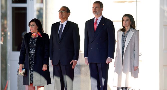 «Don Felipe y Doña Letizia recibieron oficialmente a Sus Excelencias el Presidente de la República del Perú, Sr. Martín Alberto Vizcarra Cornejo, y la Primera Dama, Sra. Maribel Díaz Cabello, en un acto que se celebró en el Palacio Real de Madrid», comunicó la Casa Real.