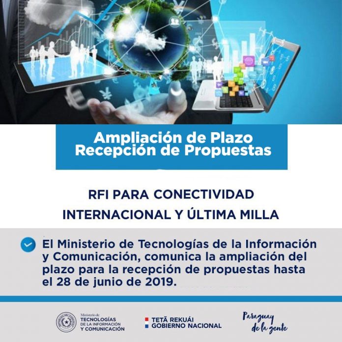 Asunción, IP.- El Ministerio de Tecnologías de la Información y Comunicación (Mitic) informó que se amplía el plazo para la recepción de propuestas del sector privado para los proyectos de conectividad del Paraguay, a nivel nacional e internacional.