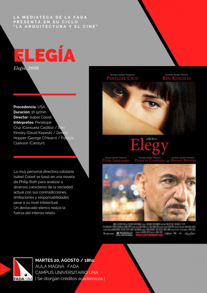 Asunción, IP.- En el ciclo de cine La Arquitectura y el Cine el próximo martes a las 18:00 en el Aula Magna de la Facultad de Arquitectura, Diseño y Arte (FADA) de la Universidad Nacional de Asunción (UNA) se exhibirá el film Elegía (Elegy).