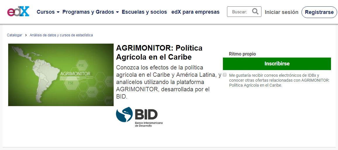 Agromonitor también presenta un curso por medio de la plataforma edX, donde se encontrarán videos de contenido en los que especialistas de varias organizaciones (BID, FAO y OCDE) comparten sus conocimientos sobre los temas cubiertos, lecturas, estudios de casos del BID en los que se promueve el análisis de políticas públicas, lecturas sugeridas y actividades prácticas que le permiten al interesado aplicar el contenido que ha aprendido.