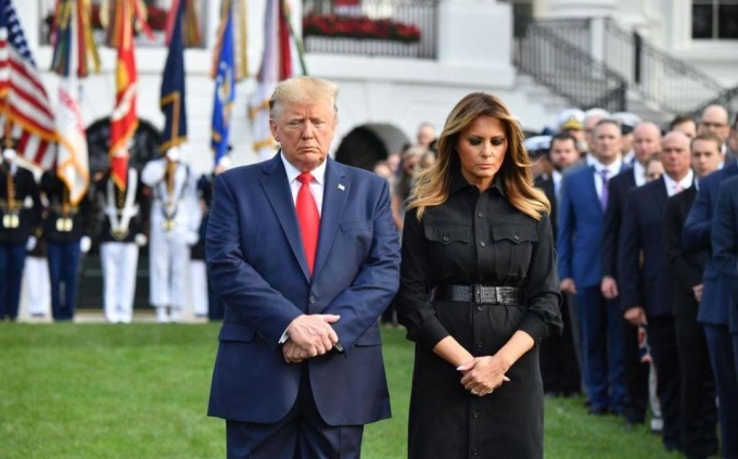 Acompañado de la primera dama Melania Trump, la pareja presidencial salió al jardín de la Casa Blanca en donde sonaron las campanas que marcaron el primer avión que se estrelló en una de las Torres Gemelas en el World Trade Center de Nueva York, aquel 11 de septiembre de 2001.