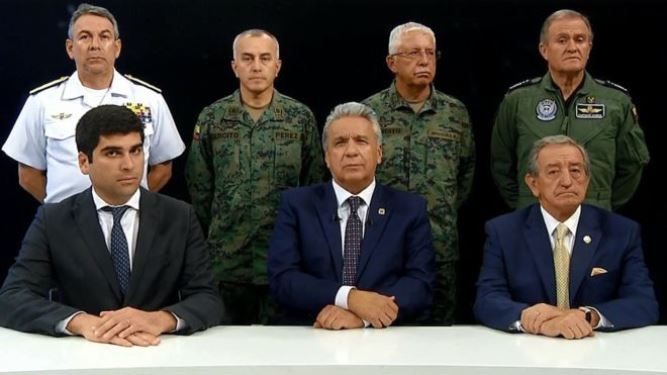 También acompañado de varios jefes militares, el mandatario culpó a Rafael Correa (2007-2017) de estar detrás de los supuestos intentos de desestabilizar a su Gobierno, y le acusó de estar detrás de lo que denominó «intento de golpe de Estado».