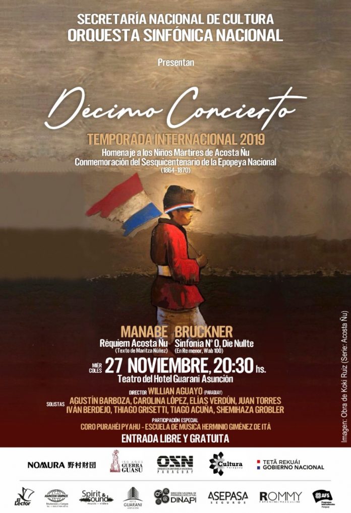 Los presentes también disfrutarán de la primera audición en Latinoamérica de la “Sinfonía Nº 0 – Die Nullte, en Re menor, de Anton Bruckner. Esta sinfonía fue compuesta por Bruckner en 1869; el mismo año de la batalla de Acosta Ñu, que conmemora el maestro Manabe en su obra.
