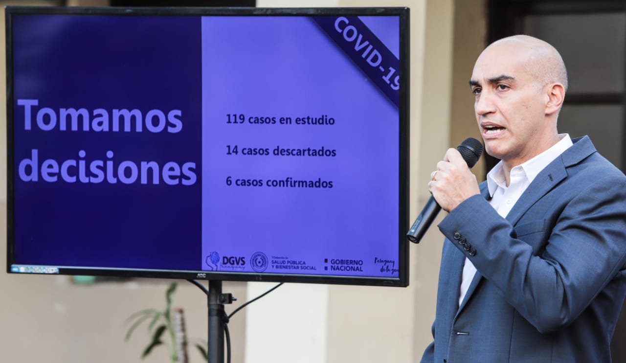 Asunción, IP.- El ministro de Salud Pública, Julio Mazzoleni, informó este viernes que siguen en seis los casos confirmados de coronavirus en el país, 14 fueron descartados y 119 se encuentran aun en estudios. En cuanto al dengue dijo que los casos están bajando de manera sostenida a nivel nacional.