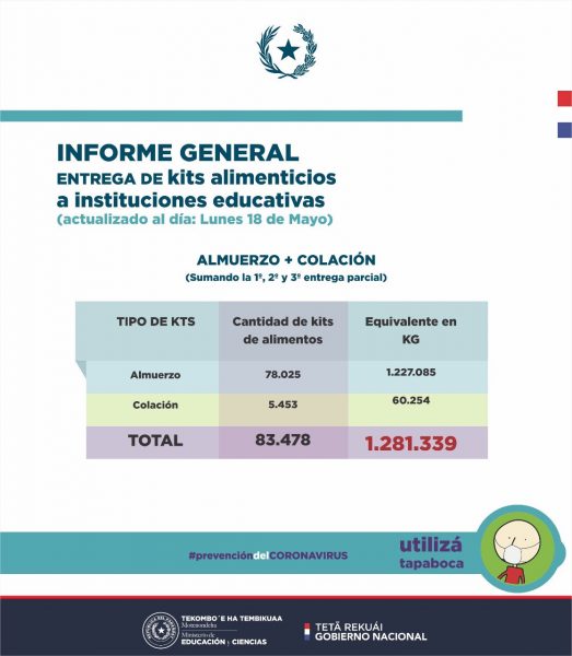 Asunción, IP.- El Ministerio Educación y Ciencias (MEC) brindó un informe general acerca de la entrega de kits alimenticios a instituciones educativas de la capital, en cuanto a almuerzo más colación, en la primera, segunda y tercera entrega parcial hasta el 18 de mayo.