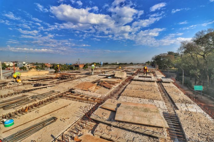 Asunción, Agencia IP.- Prosiguen los trabajos en el Corredor Vial Botánico, con la colocación de losetas, carga de hormigón, así como el montaje de vigas en el viaducto de 1.340 metros. El viaducto llevará en total 266 vigas.