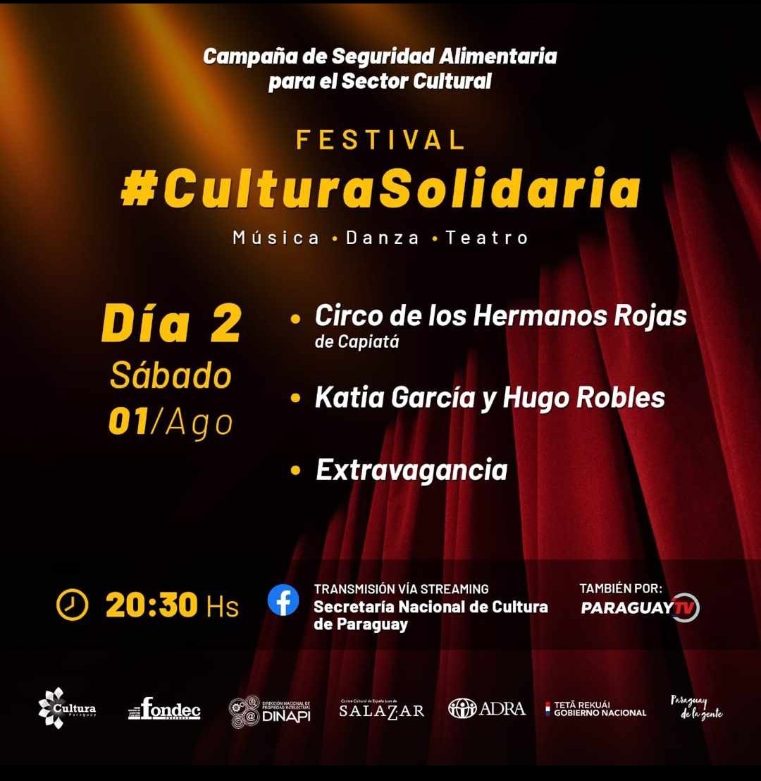 Asunción, Agencia IP.- A partir de las 20:30 horas, de este sábado 1 de agosto, vuelve el segundo día del ciclo “Festival Cultura Solidaria”, que se realiza dentro del plan de contingencia para el sector artístico de nuestro país, uno de los más golpeados por las medidas sanitarias para evitar la expansión de la covid-19.