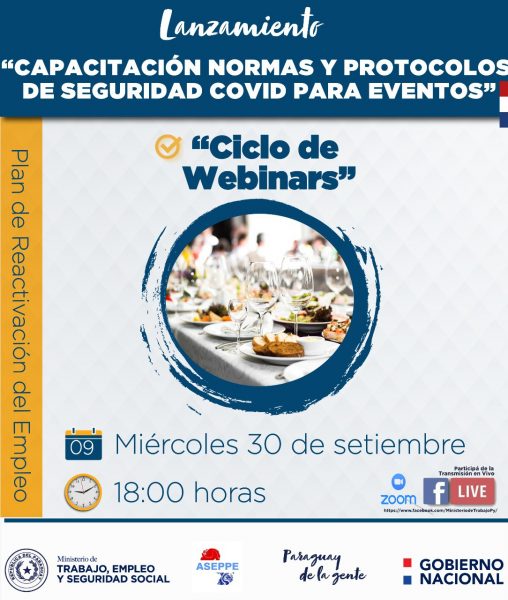 Asunción, Agencia IP.- El Ministerio de Trabajo (Mtess) inicia este jueves el ciclo de webinars para capacitar a operadores de eventos con miras a la reactivación económica gradual del sector. Será a través de la plataforma Zoom y del Facebook a partir de las 18:00.
