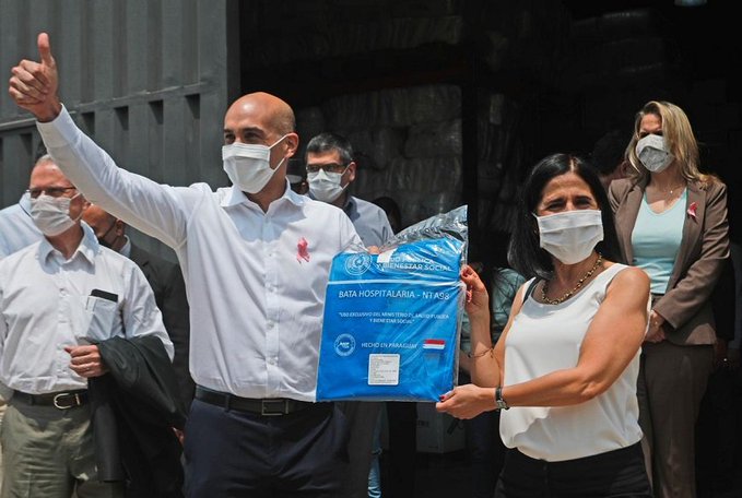 El ministro de Salud, Julio Mazzoleni, a su turno, refirió que hace seis meses, a inicios de la pandemia, «el Paraguay no producía ninguno de los equipos de protección individual ni mascarillas, batas, trajes de protección, absolutamente nada»; por lo que su confección es todo un logro para la industria nacional, que además está orientada a abastecer a los establecimientos sanitarios del país.