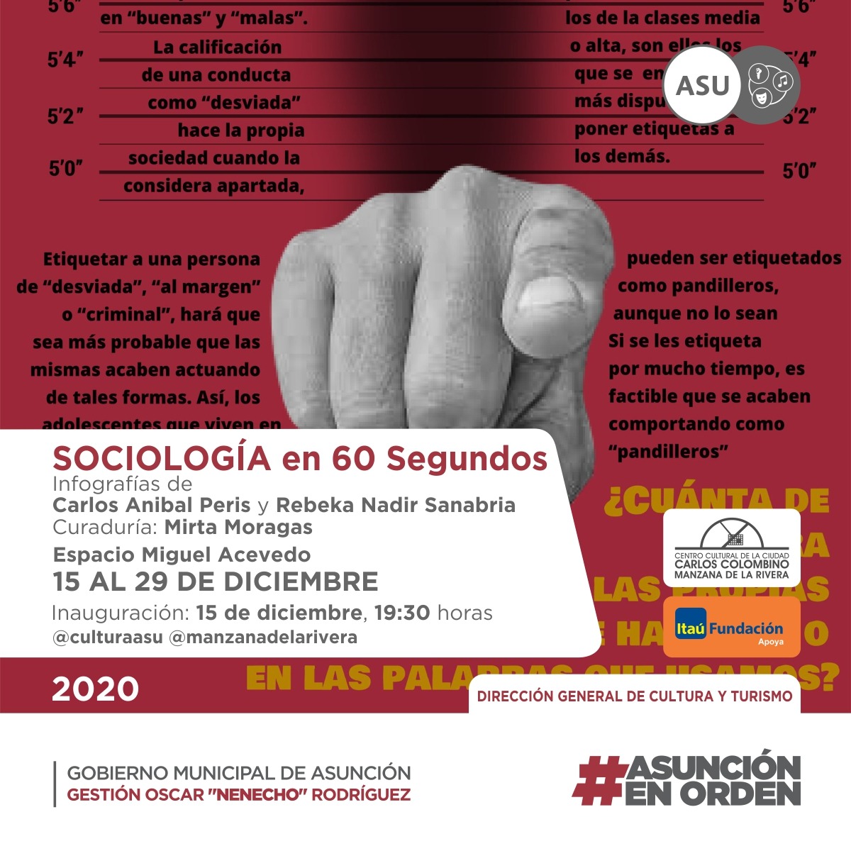 Asunción, Paraguay, Agencia IP.- “Sociología en 60 Segundos” es la exposición que se habilitará este martes 15 de diciembre, en el Espacio Miguel Acevedo, del Centro Cultural de la Ciudad Carlos Colombino Manzana de la Rivera, (Ayolas Nº129 casi El Paraguayo Independiente).
