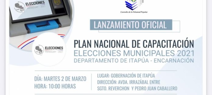 De acuerdo con el cronograma de presentación del referido plan, la Ministra miembro del Tribunal Superior de Justicia Electoral (TSJE), María Elena Wapenka acompañará la jornada de capacitación del martes 2 de marzo en la ciudad de Encarnación, a partir de las 08:00, en el local de la Gobernación del Departamento de Itapúa que convoca a jefes distritales.