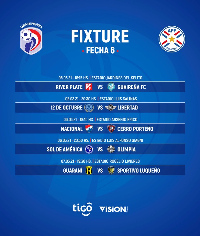 Posteriormente a las 20:30 en el Estadio Luis Salinas de la ciudad de Itaugua, el 12 de octubre recibirá a Libertad con arbitraje de Éber Aquino.
