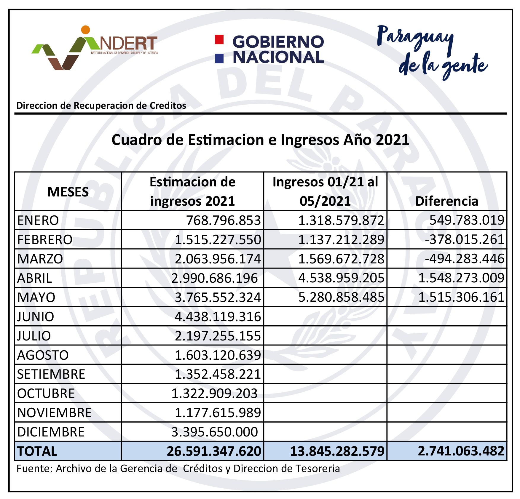 Asunción, Agencia IP.- El Instituto Nacional de Desarrollo Rural y de la Tierra (Indert), logró superávit de ingresos en los primeros cincos meses del año al recaudar 13.845.282.579 guaraníes, recursos que le permitirán al ente contar con fondos propios para cumplir objetivos.