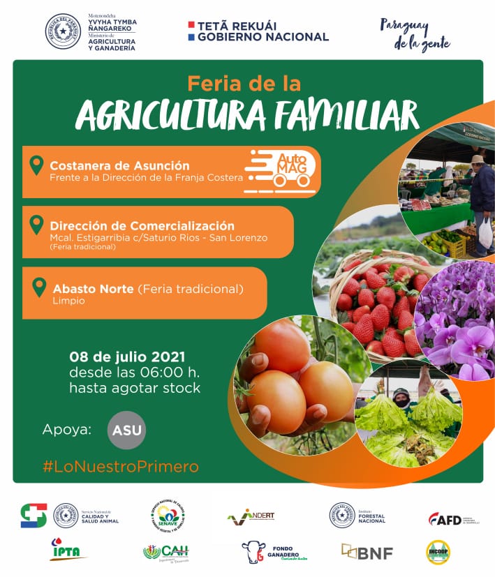 La feria se realizará bajo la modalidad de compra desde los vehículos desde las 06:00 de la mañana y hasta agotar stock en la Costanera de la ciudad de Asunción, frente a la Dirección de Comercialización, ubicada en la ruta Mariscal Estigarribia casi Saturio Ríos de la ciudad de San Lorenzo, y en el Abasto Norte, de la ciudad de Limpio.
