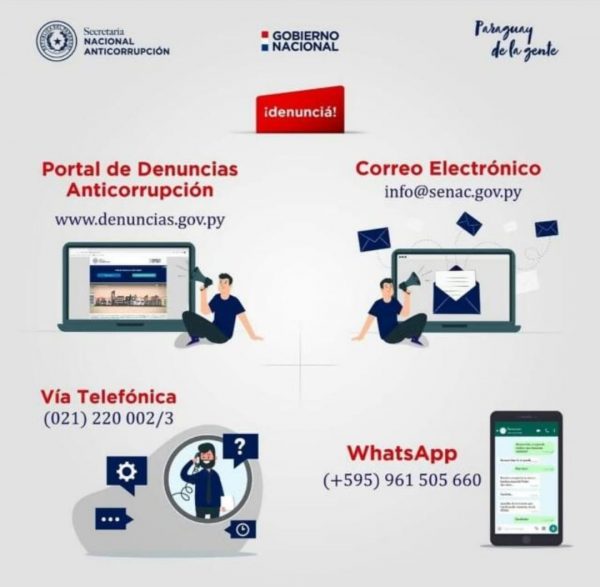 Asunción, Agencia IP.- La Secretaría Nacional Anticorrupción (Senac) recuerda a la ciudadanía que están disponibles cuatro vías para presentar denuncias por supuestos hechos de corrupción que afecten a instituciones del Poder Ejecutivo. Estas son: el portal de denuncias, el WhatsApp, correo electrónico y la línea baja.