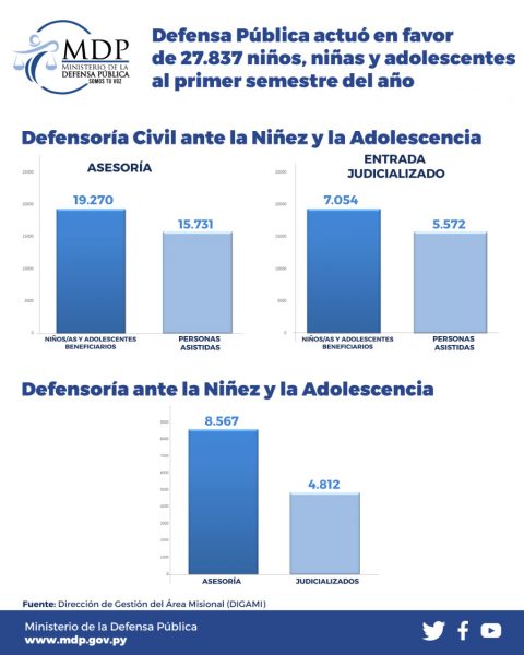 Asunción, Agencia IP.- La Defensa Pública actuó en favor de 27.837 niños, niñas y adolescentes de enero a junio de este año, a través del Fuero Civil ante la Niñez y la Adolescencia y del Fuero Niñez y Adolescencia.