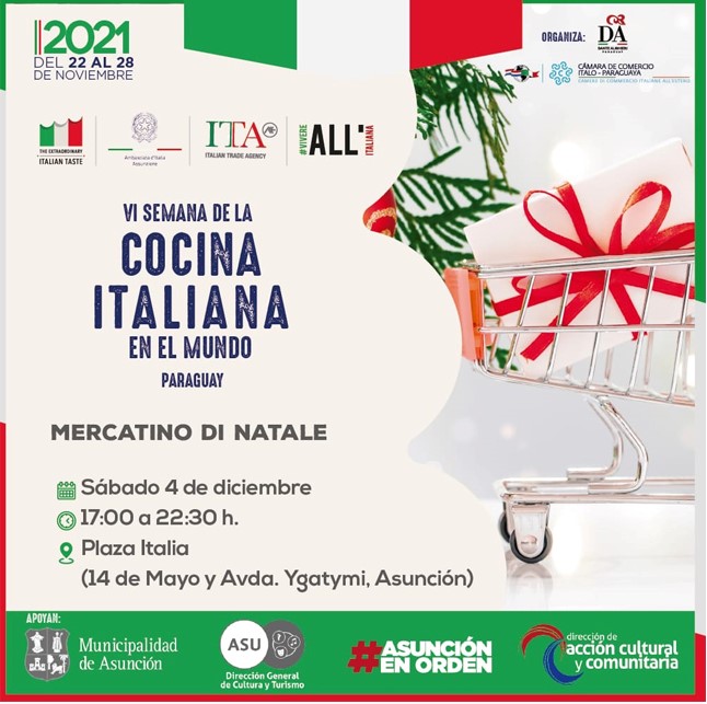 Viviana Ruggero, presidenta de la Sociedad Dante Alighieri, dijo que buscan recrear «la atmósfera de un auténtico mercadito italiano navideño en Asunción», donde se podrán saborear platos típicos italianos, como lasagna, arancini siciliani, gnocchi, pizza, panini con salsiccia y tiramisú, entre otros, y comprar productos como vinos, cuadros y artesanía; todo eso, acompañado por música italiana y navideña y otros números artísticos.