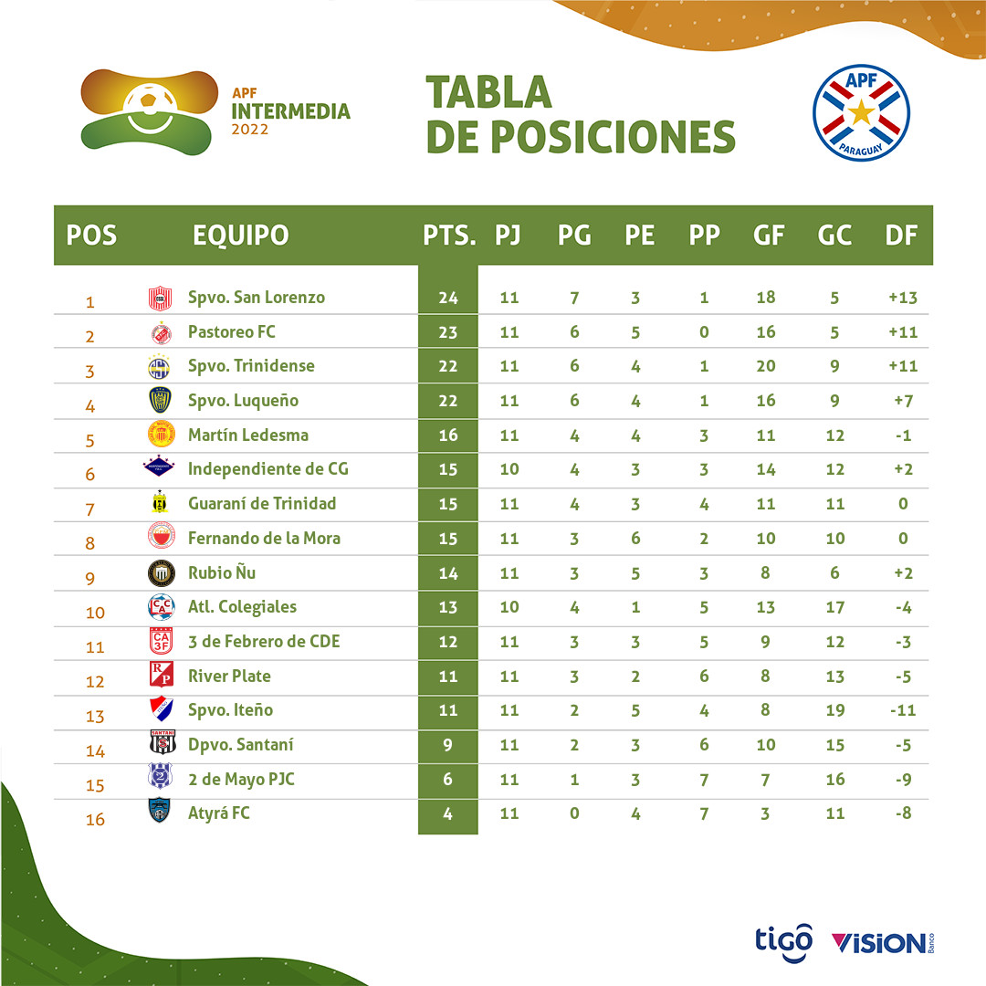 En segunda colocación se ubica Pastoreo con 23 unidades y más atrás Luqueño y Trinidense con 22 puntos en las principales ubicaciones.
