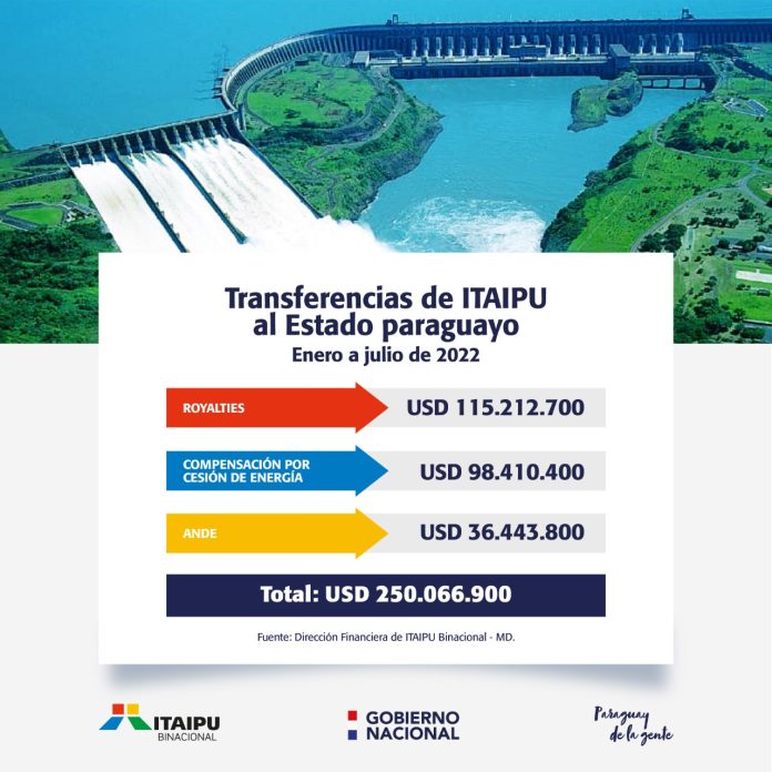 En estos siete meses del 2022, Itaipu remesó poco más de USD 115 millones por royalties y USD 98 millones por cesión de energía al Tesoro Nacional.