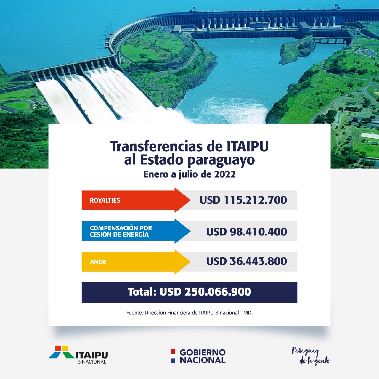 En lo que corresponde solo a las transferencias efectuadas en julio, los royalties totalizaron USD 17 millones, mientras que los pagos por cesión de energía alcanzaron USD 15 millones y la ANDE recibió 1,3 millones por resarcimientos; significando así USD 33 millones los desembolsos hechos por ITAIPU a favor del país en el séptimo mes del corriente año.
