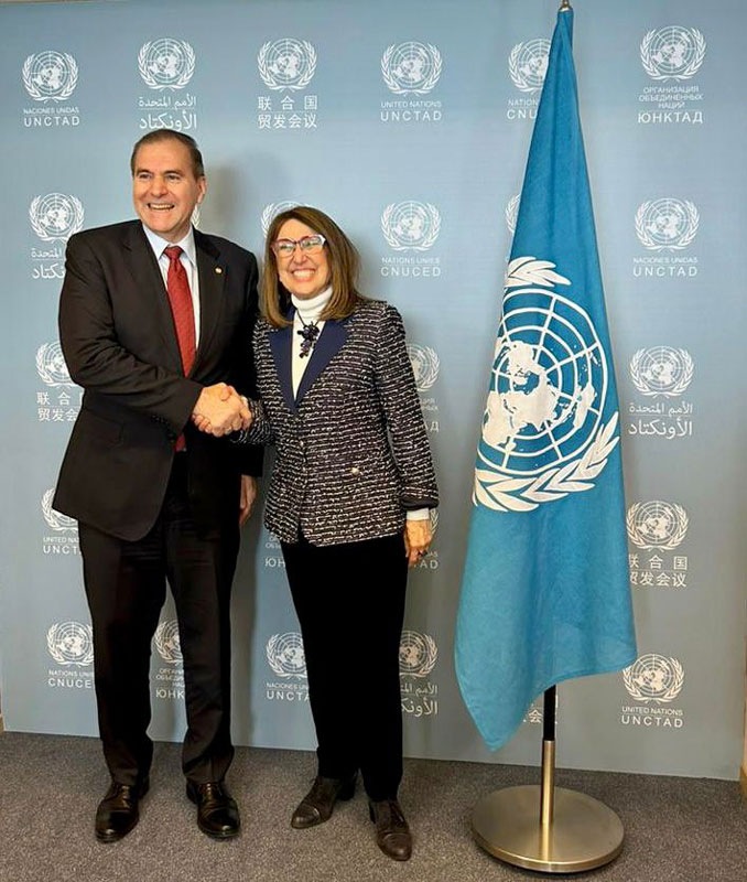 El canciller se reunió con la secretaria general de la Conferencia de las Naciones Unidas sobre Comercio y Desarrollo (UNCTAD), Rebeca Grynspan, en la sede de dicho organismo en Ginebra, Suiza.