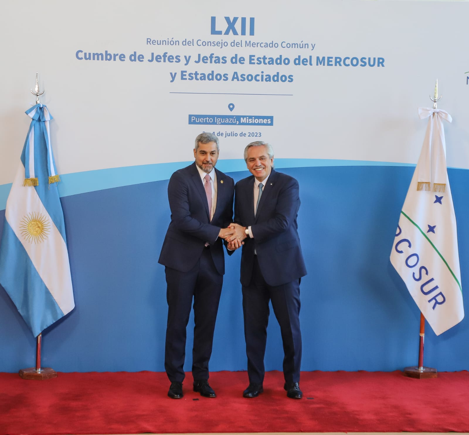 A su vez, Mario Abdo Benítez llegó acompañado por el mandatario entrante al referido encuentro regional.