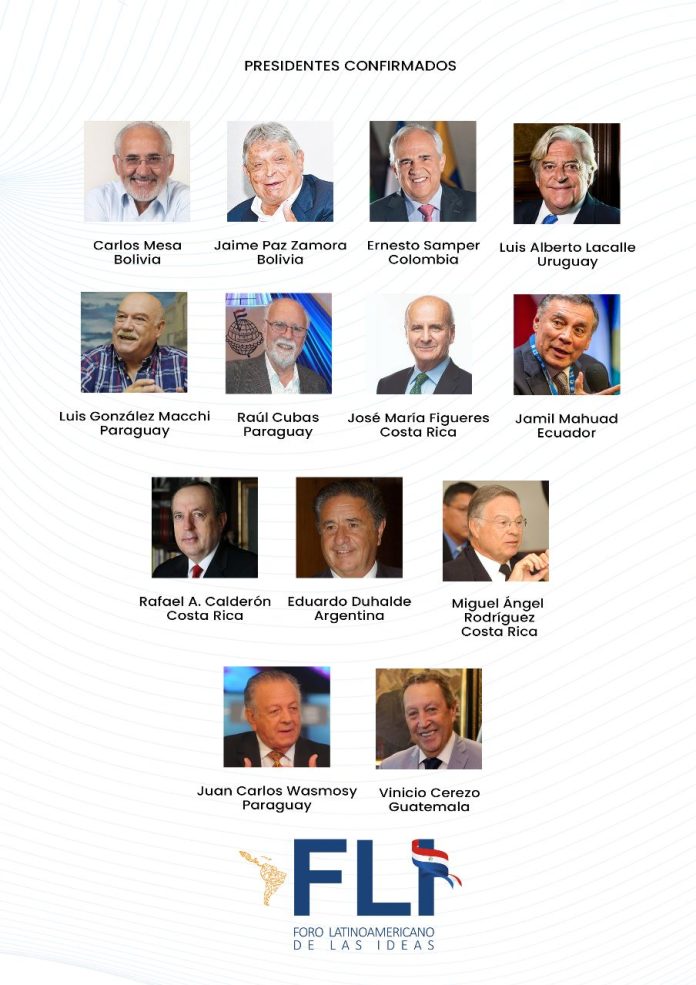 Asunción, Agencia IP.- Al menos 13 expresidentes latinoamericanos confirmaron presencia para el Foro Latinoamericano de las Ideas (FLI) que se desarrollará en Paraguay los días 11 y 12 de julio, en el Centro de Convenciones de la Conmebol.