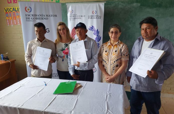 Asunción, Agencia IP.– La presidenta del Instituto Paraguayo del Indígena (INDI), Marlene Ocampos, hizo entrega de titulos de propiedad a varias comunidades de los departamentos de Canindeyú y San Pedro, como parte de la política del Gobierno Nacional de garantizar a las familias nativas la tenencia sobre sus territorios.