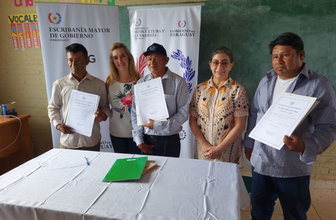 En compañía de la Escribana Mayor de Gobierno, Ana María Zubizarreta, directores del INDI y del Proyecto de Inserción a los Mercados Agrarios (PIMA) del Ministerio de Agricultura y Ganadería (MAG), Ocampos entregó títulos, primeramente, en la comunidad indígena Sanja Morotí, distrito de Yasy Cañy, departamento de Canindeyú.