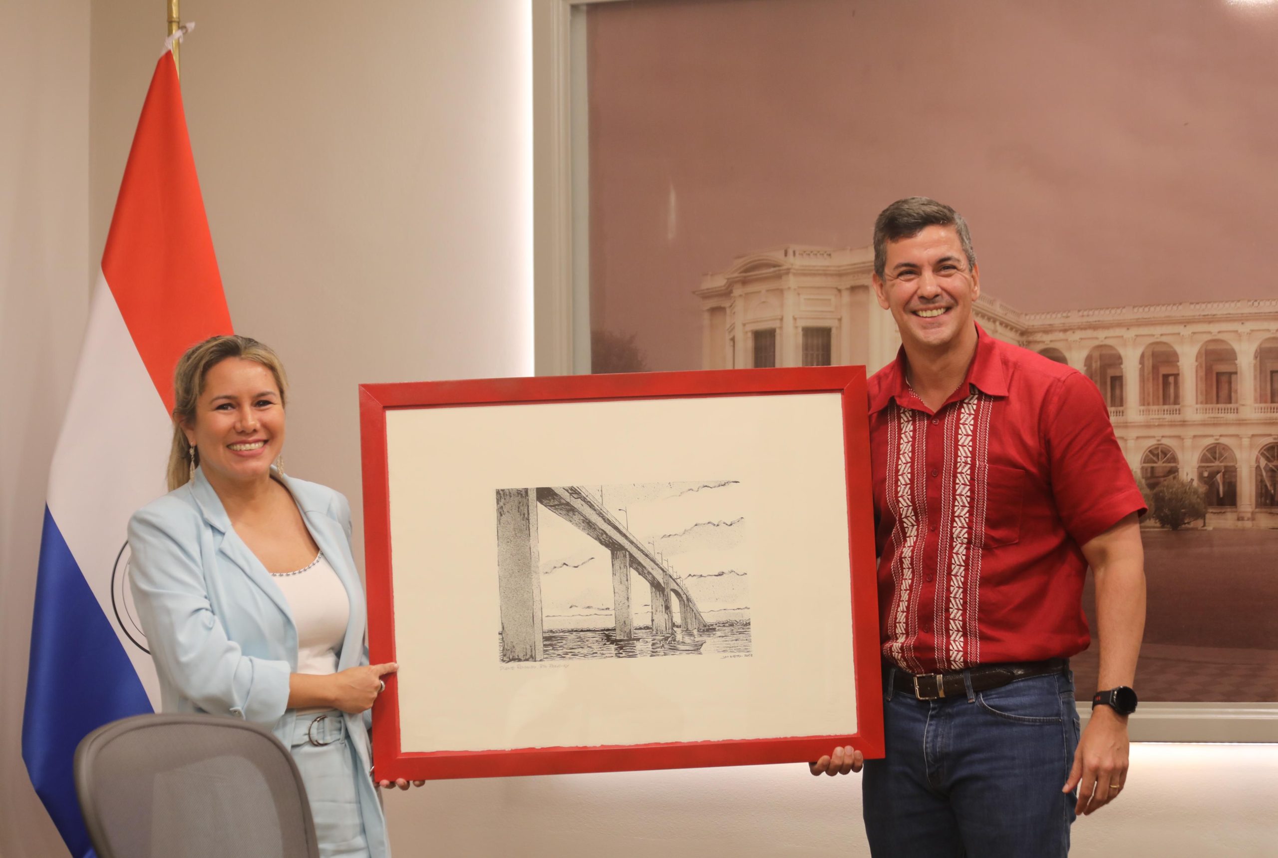 Asunción, Agencia IP.- La ministra de Turismo, Angie Duarte, entregó al presidente Santiago Peña, un presente que refleja el puente existente entre Paraguay y España, reflejado en un cuadro enviado por Eduardo Álvarez Rodríguez, CEO de Puentia, consultora española de Comunicación Estratégica.