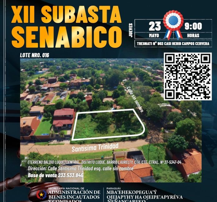 Asunción, Agencia IP.- La Secretaría Nacional de Administración de Bienes Incautados y Comisados (Senabico), realizará una subasta de vehículos, motocicletas, aviones e inmuebles, el próximo jueves 23 de mayo, a las 09:00 horas, en el local ubicado en Tregnati N° 902 casi Herib Campos Cervera. El 50% de lo recaudado se destinará a programas de rehabilitación de personas con problemas de adicción, en el marco del Plan Sumar, impulsado por el Gobierno.